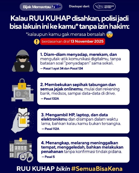 Lebih jauh, isu privasi digital juga menjadi perhatian publik dalam pembahasan revisi KUHAP ini. Pasal 132A yang mengatur tentang penyadapan dan pemblokiran aset dinilai memiliki potensi eksesif. Aturan tersebut memungkinkan penyidik membekukan rekening hingga menyita perangkat elektronik seperti laptop dan ponsel dalam waktu lama. Bahkan, tindakan tersebut dapat dilakukan terhadap individu yang bukan tersangka utama dalam suatu perkara. Kebijakan ini dikhawatirkan tidak hanya mengganggu privasi, tetapi juga melumpuhkan aktivitas ekonomi dan sosial masyarakat. Pengamat menilai aturan tersebut harus diawasi ketat agar tidak disalahgunakan.
